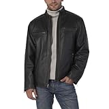 | Contrast topstitching outlines a stand-collar leather jacket fronted by two zippered chest pockets. ...Read